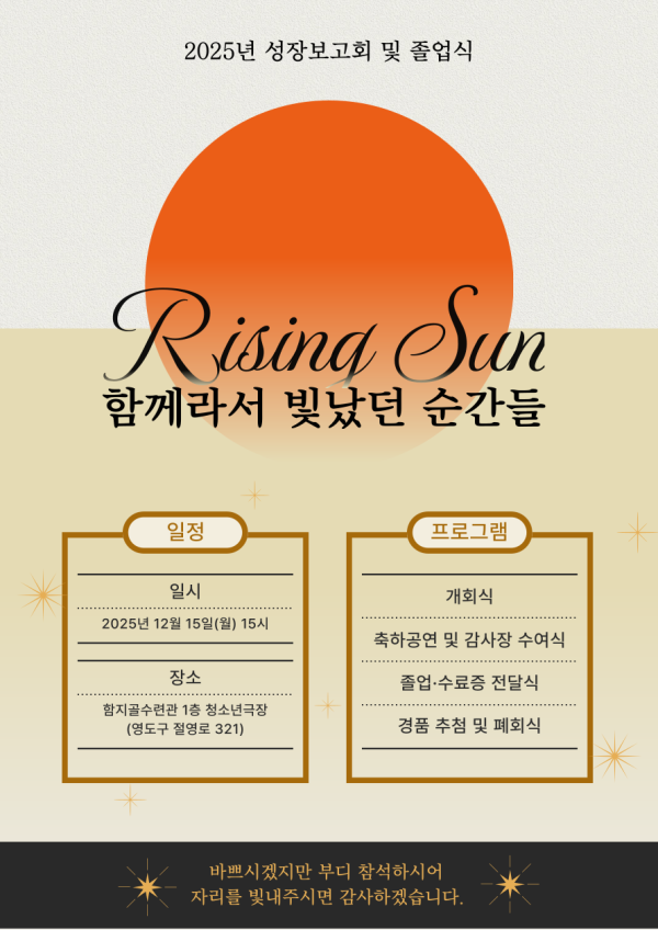 올 한해가 저물어져가는 12월, 2025년 성장보고회 및 졸업식 "함께라서 빛났던 순간들: Rising Sun" 참여자를 모집합니다.
