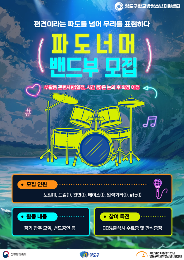 접수중 [학교밖] 2026년 자립지원 사업 밴드동아리 「파도너머」동아리원 모집