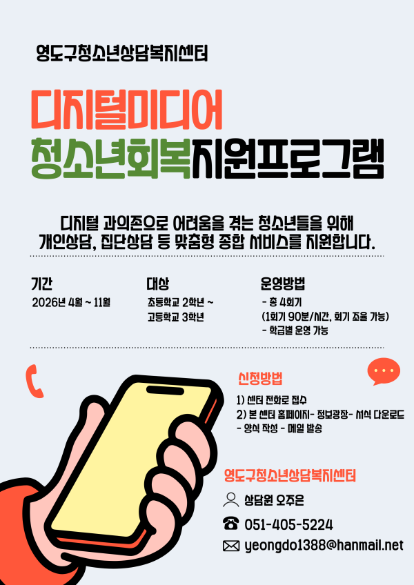 접수중 [상담복지센터] 2026년 영도구청소년상담복지센터 디지털미디어 피해 청소년 회복지원사업 안내