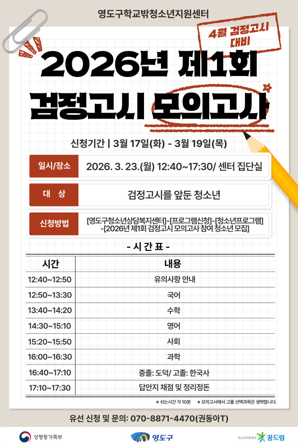 접수중 [학교밖] 2026년 제1회 검정고시 모의고사 참여 청소년 모집