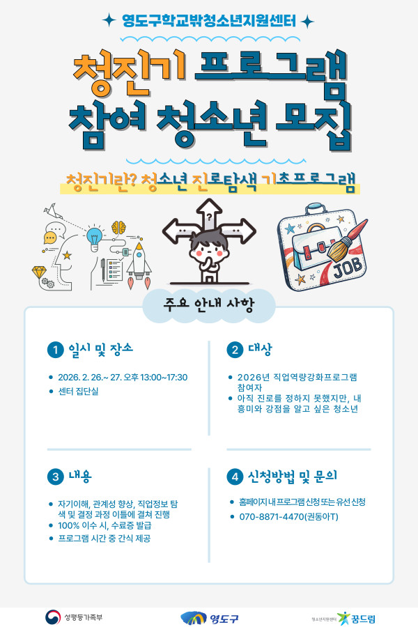 접수중 [학교밖] 청진기('청'소년 '진'로탐색 '기'초프로그램) 참여자 모집