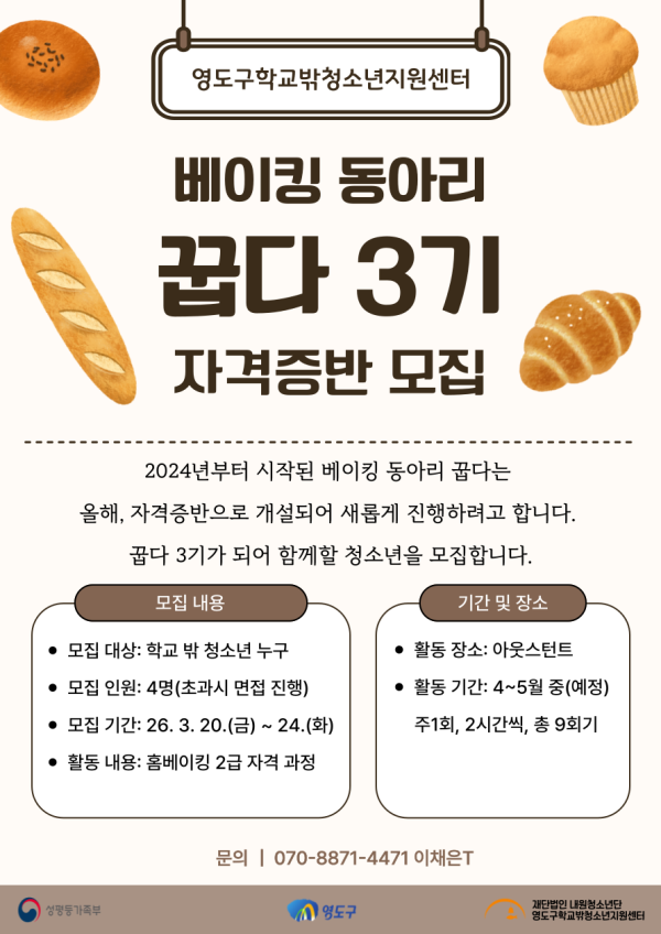 접수중 [학교밖] 2026년 자립지원 사업 자기계발 프로그램 「베이킹 동아리 '꿉다' 자격증반」참여자 모집