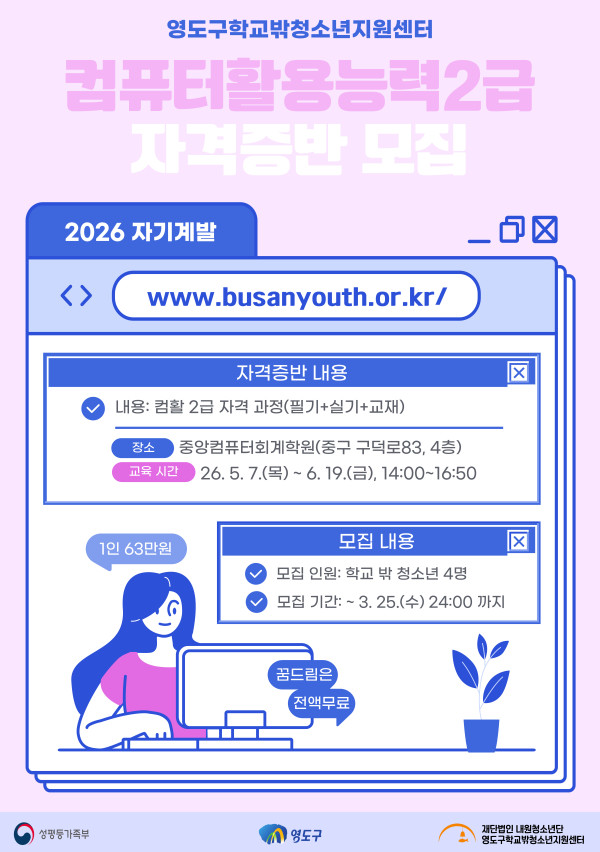 접수마감 [학교밖] 2026년 자립지원 사업 자기계발 프로그램 「컴퓨터활용능력2급 자격증반」참여자 모집